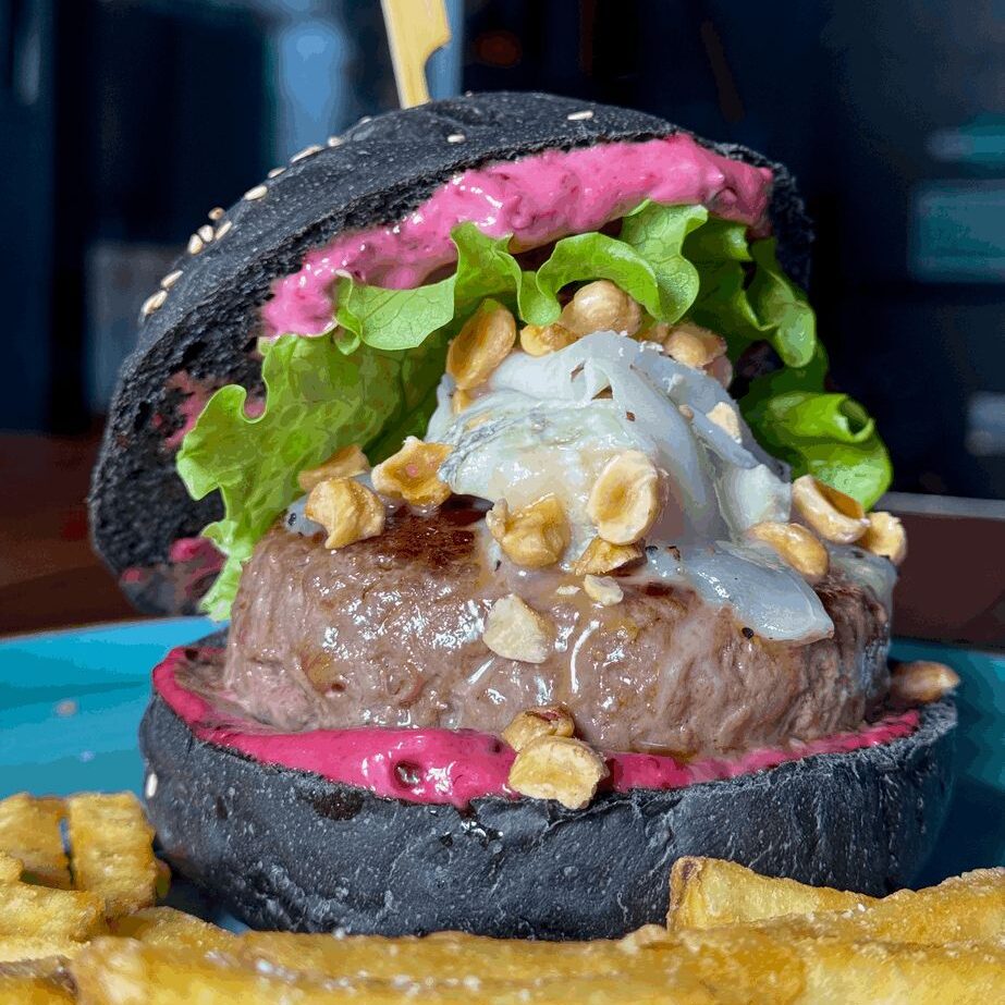 Morbido pane al carbone vegetale, polpetta di manzo di prima scelta da 200gr, mayo alle more, crumble di nocciole, lardo di patanegra, formaggio smo king e foglia di insalata gentile + patatine fritte